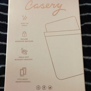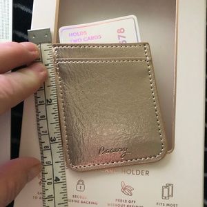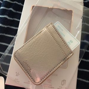 CASERY THIS IS A BRAND NEW IN BOX, ROSE GOLD FAUX LEATHER POCKET THAT ADHERES ITSELF TO THE BACK OF YOUR PHONE. SUPER CONVENIENT TO POT YOUR ID AND CAHS OR CREDIT CARD IN IT.