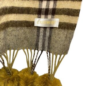 CASHMERE Olive chartreuse rabbit fur balls trim Nova Check Plaid Shawl Wrap FALL