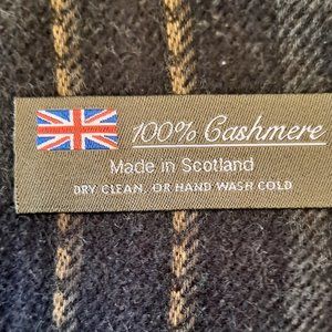 100% CASHMERE SCARF. MADE IN SCOTLAND. BLACK, GRAY, BEIGE STRIPES. 64" LONG. NO RIPS, TEARS, OR STAINS.