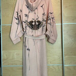 skeletal floral motif. The hoodie part has birds flying and it ties with a cashmere tie.