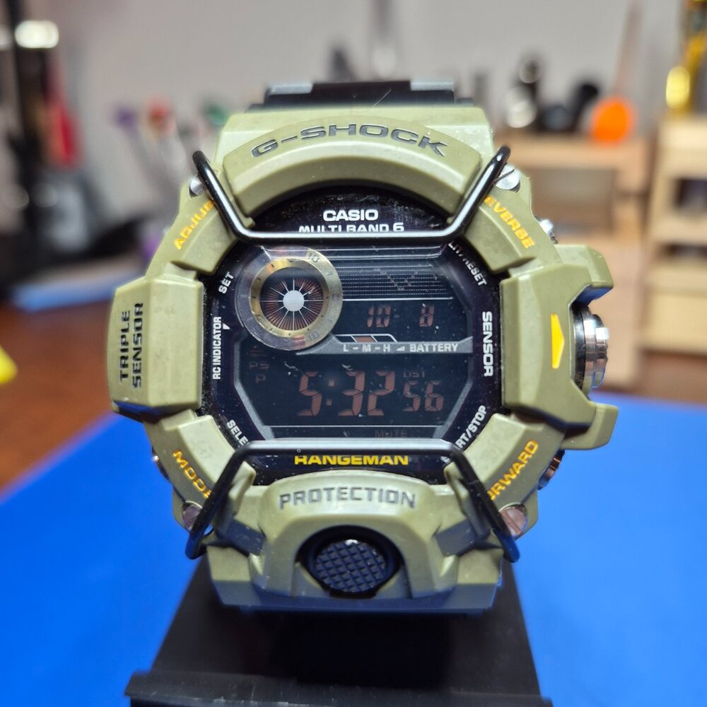 Casio Rangeman watch GW-9400. Radio controlled, solar powered. Compass, barometer, altitude. OD green case, black S/S bracelet. Excellent condition. GB14