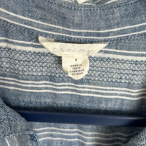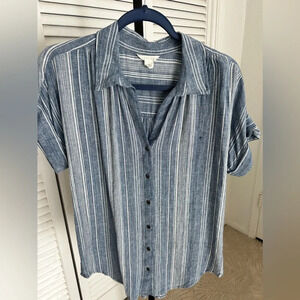Crisp stripes further the easygoing sophistication of a short sleeve shirt woven from a lightweight linen blend.