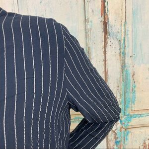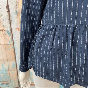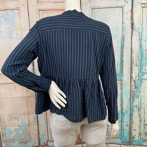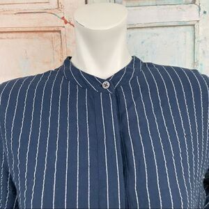 This Caslon shirt is in good used condition. Navy blue and white stripes. Button down style with no collar. Slight peplum effect at the waist. No notable wear. Size M petite.