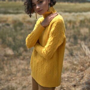 Yellow Cable Knit Turtle Neck Long Sleeve Dropped Shoulders Loose Fit Sweater