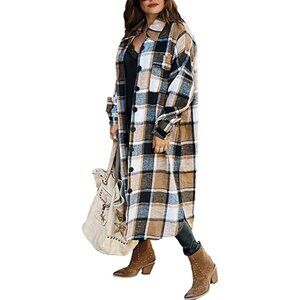 NWT Women's Casual Khaki Plaid Button Down Long Puff Sleeve Trench Coat Jacket Shacket Wool Blend