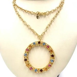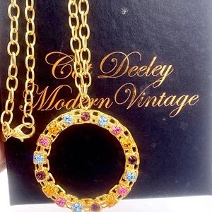 Fabulous necklace by Cat Deeley, From her Modern Vintage Jewelry line. The necklace comes in its original retail Cat Deeley box. The necklace is new without tags. Box shows some marks on top but the necklace is pristine and new! 5 mm wide chain measures 28" long. Hang tag marked Cat. The circle pendant measures 2 1/8" diameter. The pendant has blue, pink, purple, and deep yellow 4 mm rhinestones that just sparkle against the gold metal! Inspired by her vintage jewelry finds!
