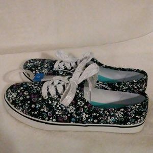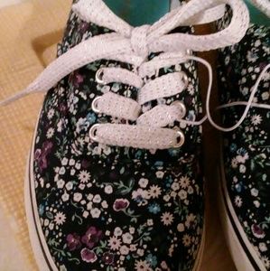 🔵💜Beautiful blue floral pair of sneakers. 💜🔵 Colors of blues, whites, pinks, purples & hint of greens. Lovely floral pattern. Sparkling shoestrings. SIZE: 4 (big girls)
