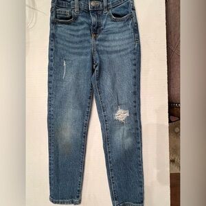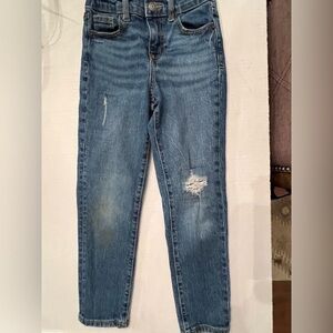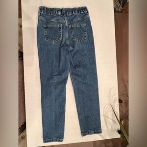 Skinny legs at a regular fit Super stretch denim Elastic waist only in back of pants.