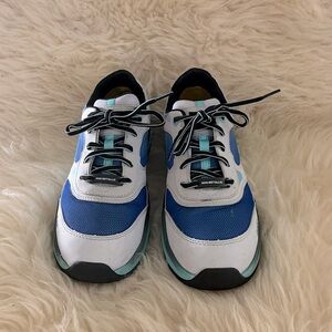 These sturdy work shoes are in great condition, barely worn. They have heavy duty rubber hiking style soles, steel toe and cute sneaker style.