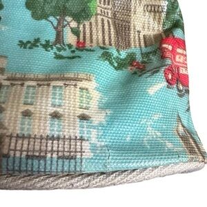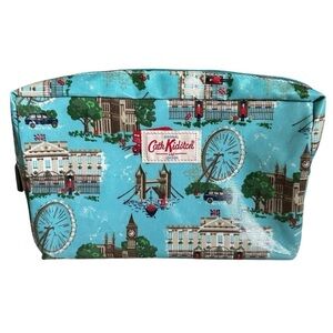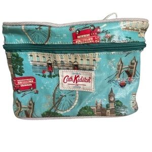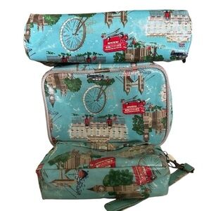 Cath Kidston 3 piece travel set. With an all over London scene print against a turquoise blue background. Made with an easy to clean oilcloth.