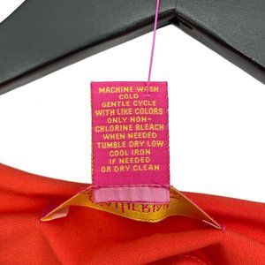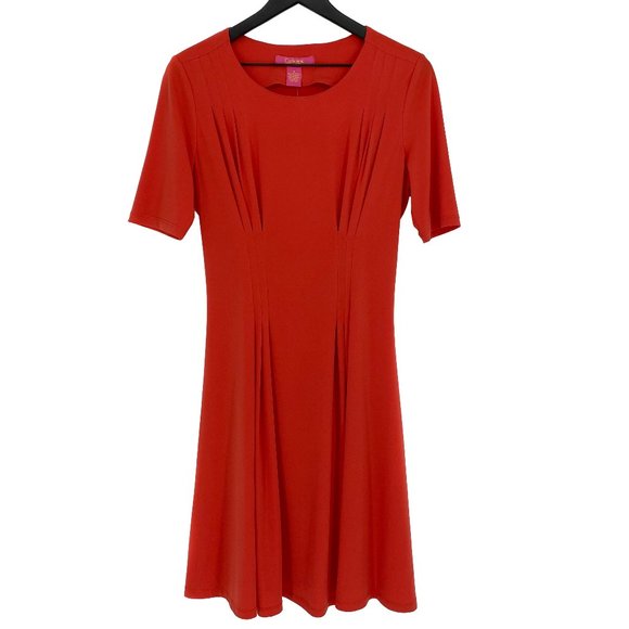 Description: Spruce the autumn with a lovely Catherine Malandrino for the season in the home or casual wear. The Catherine Malandrino has intricate detailing of pleats on the bodice and skirt for accent on the front and back. This dress has a round neckline, short sleeves, complimentary pleated detailing from bodice to the skirt, and touch of the retro color of an orange coral. Style with mules and chain link purse.