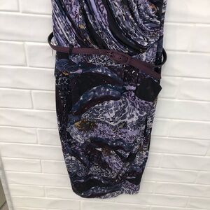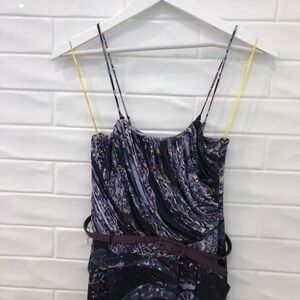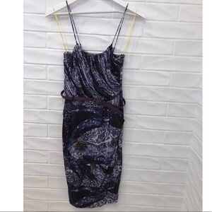 A seamless transition from day to night, this print silk dress features a scoop neckline and a draped, ruched bodice. Buckled belt at waist and pleating at front. Slant hip pockets and hidden side zip. Spaghetti straps that are removable Lined at bodice.