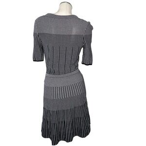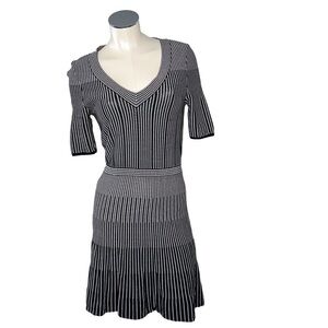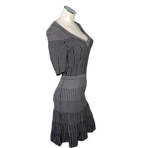 The Catherine Malandrino Connery Dress is a sleek, chic addition to your wardrobe. It features a fit & flare silhouette with longer short sleeves, a v-neckline and a flattering waistband. Crafted from stretchy fabric, it has a modern black and white striped pattern accented with mini square blocks. It combines style with comfort for a sophisticated look.