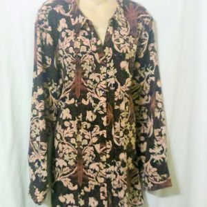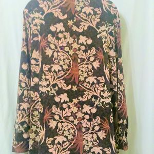 This lovely floral print blouse is made by Catherine's and is a size 2X. The blouse is done in a 97% polyester 3" spandex blend. Measurements are: Bust 58, waist 58", hips 62", sleeve 25". In beautiful condition!