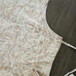 The CATHERINES Maxi Dress is a sleeveless, floral patterned dress in size 4X, made from a blend of rayon and linen. It features a boat neck and a pullover closure, making it suitable for various occasions such as travel, parties, casual outings, and workwear. This beige dress with a nature-themed design exudes a bohemian and Hawaiian vibe, offering comfort and style for the modern woman. See pictures for measurements