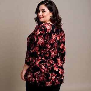 CATHERINES PETITE 1XWP VELVET FLORAL TUNIC TOP BLACK RED STRETCH 3/4 SLEEVE