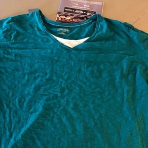 V-neck aquamarine colored top. Short sleeves. Never been in the dryer. Sits about 3 inches below the waist. Very comfortable.