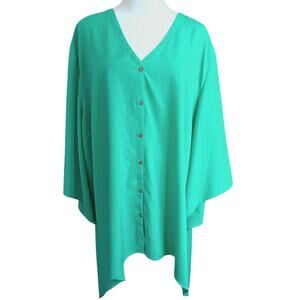CATHERINES Turquoise Green Blouse Top Plus 3X Flowy Asymmetric Hem V-Neck Career