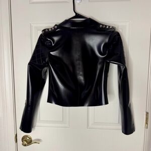 Barely Worn: Latex biker jacket made from 0.8mm thick latex, with studded lapels and epaulettes. Laser-etched criss-cross detail at the top of the sleeves. Size small.