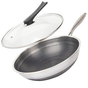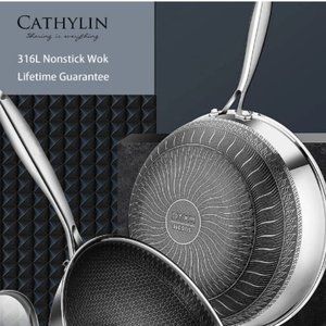 CATHYLIN: 12.5"/ 1 QT - Nonstick Stainless Steel Wok Pan with Lid - Hex Cladded Non-Stick Skillet with Stay-Cool Handle
