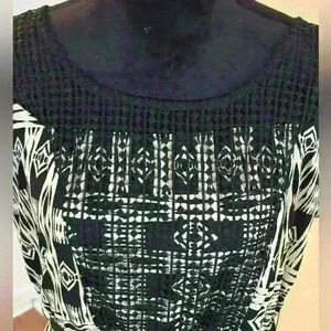 CATO Black & Crème Aztec Print Round Neck Sleeveless Maxi Dress Size XL is in Excellent Used Condition. This beautiful gown and it’s very interesting design that includes a neckline made out of netting was made of Poly/Spandex, neckline is Poly and lining is Poly. Retail priced at $60 this amazing dress can be yours for just $30!! Pics taken using a Size 4-6 Mannequin. Dress may have been gathered in the back to show form.