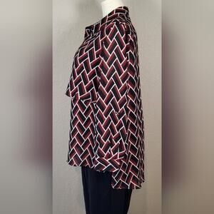 A statement blend of polish and comfort, this Cato Overlap Front V-Neck Top drapes effortlessly for a flattering, flowy fit. The bold geometric pattern in black, rust, and brick red gives instant visual texture—perfect for office wear or casual chic weekends. Pair with dark jeans or tailored pants for easy confidence.
