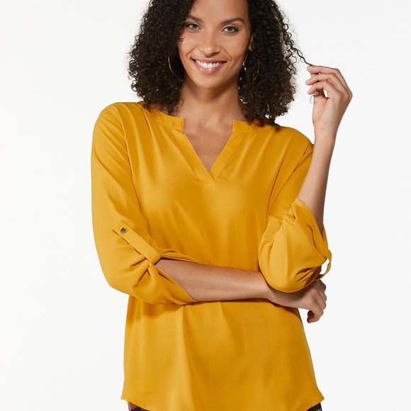 This dressy style is one to wear to work, zoom calls or an evening out with the girls with its vibrant hue, relaxed-lightweight fit and high-low hem. A dream with denim and so pretty with plaid. Roll tab sleeves 100% polyester Machine wash Imported