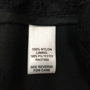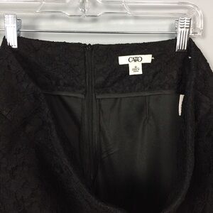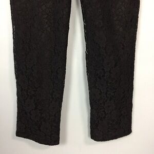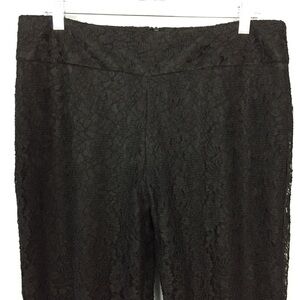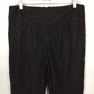 Beautiful lace overlay pants by Cato. Fully lined. 100% nylon lace and 100% polyester lining. Machine wash inside out gentle cycle, tumble dry low. Hook and eye and hidden zipper in center back of pants. No pockets.