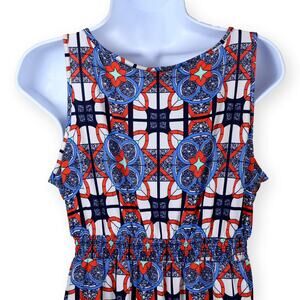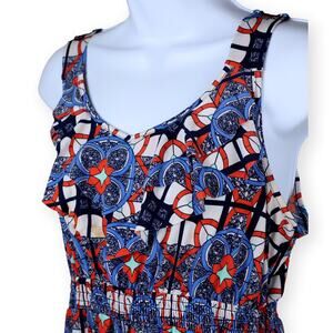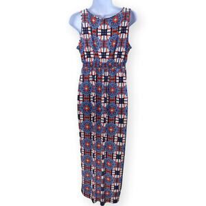 CATO Girls Multi Color Abstract Maxi Dress 18. Adorable and flattering sleeveles maxi dress. Blue, Orange patchwork design. Ruffle on neckline. Elastic waist. Girls size 18, but fits like woman’s small/medium petite