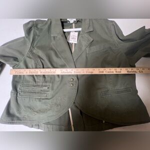 Chic olive green blazer with embroidered details. Features button closure and front pockets. Perfect for a polished look.
