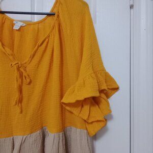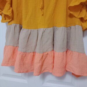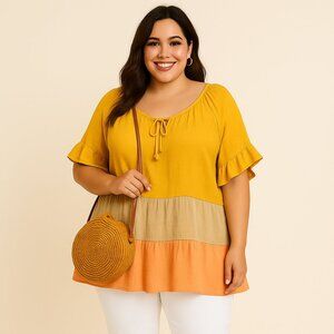 Channel effortless summer vibes with this stunning CATO plus-size boho-chic peasant blouse in size 18/20W, featuring vibrant color-blocked tiers of mustard yellow, soft beige, and peachy coral. Designed in airy crinkled cotton gauze with feminine flutter sleeves (single ruffle), it's the perfect piece for warm-weather layering.