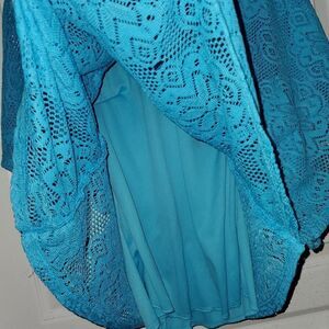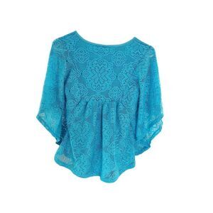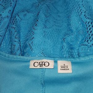 Beautiful blue top from CATO. It is a batwing style with a lace overlay and silky soft underneath. Very pretty shirt. The pit to pit is approximately 17 inches.