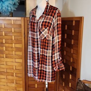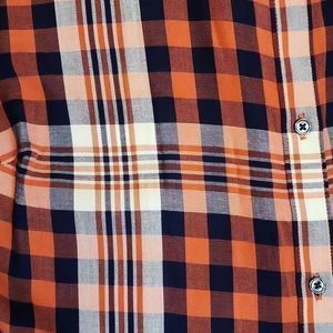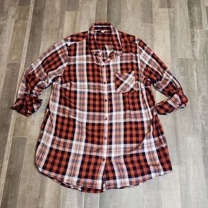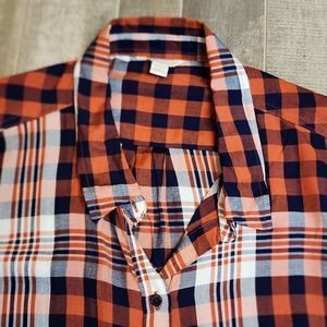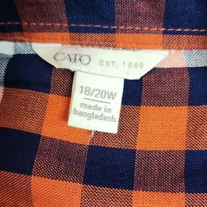 Cato brand Cotton blend plaid button down shirt in orange cream and navy plaid material. NWOT. Size 18/20 Womans. measurements are 24 inches across the chest laying flat and 32 inches in length from shoulder to hem. sleeve length can be worn long to the wrist or 3/4 length.