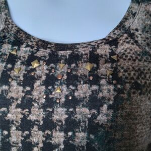 Ready for fall, a mixed print long sleeve top by CATO. Brown, black, & green together with black topstitching, rounded neckline, rounded lower hem, & some antique brass accents on upper front. Looks great with jeans!