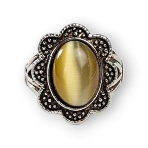 CATSEYE Glass Flower Ring Oxidized Silver Tone Yellow Oval Cabochon Vtg Size 7