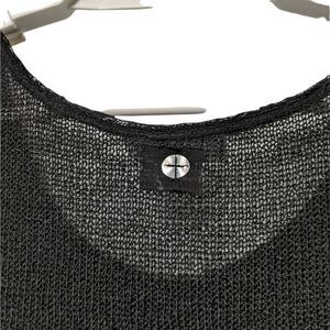 Lightweight knit. Crochet detail with lace tag detail at front. Asymmetrical hem.