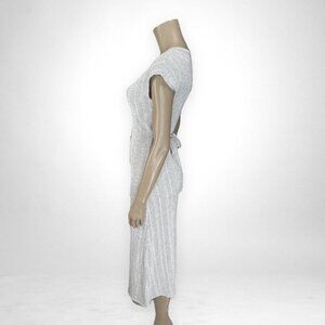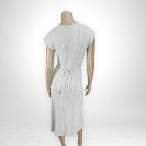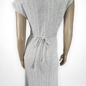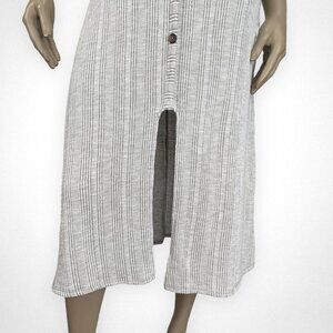 Caution to the Wind gray midi dress is stylish and comfortable. Lightweight. Ribbed. Button closure in front. V-neck. Ties at back. Sleeveless. Stretchy. Not lined.