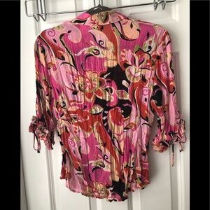 Really kool scrunchy look with a blend of bright & cheerful colors. Mid length sleeves & Shapes you nicely.