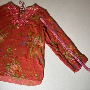 Still life floral on sheer 100% silk. Dusty rose coral. Embroidered neckline, embellished with tasteful silver mini sequins and a tie closure.