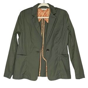 CAbi #207 army green one button blazer jacket. Front hip pockets, as well as breast pocket. Flap in back for room. Small shoulder pads. Push sleeves up for casual look or down for a more dressy look. Perfect for office or weekend! Great transitional piece! Size S