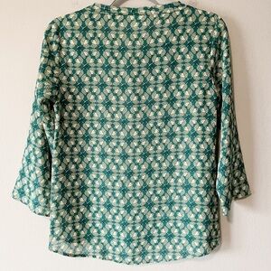CAbi #3069 Jade Top in green and tan. Size XS. Geometric leaf print. Slightly sheer. Round neckline. 3/4 sleeves. Very slight high low hem. Retailed for $89. Pre-owned, excellent used condition- there is writing on interior care tag.