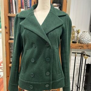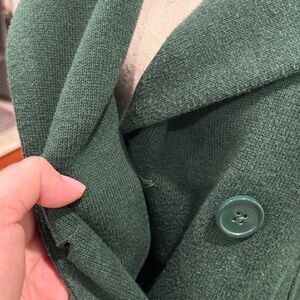 Elevate your winter wardrobe with this stunning green pea coat from CAbi's Love Carol Collection. The cotton blend outer shell provides both comfort and durability, while the knit fabric type adds a cozy touch. The solid pattern and button accents create a stylish look that will surely turn heads.