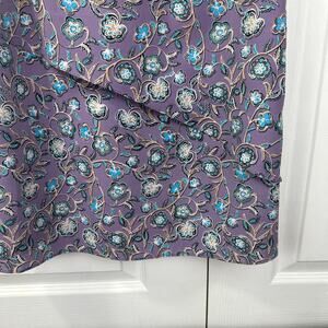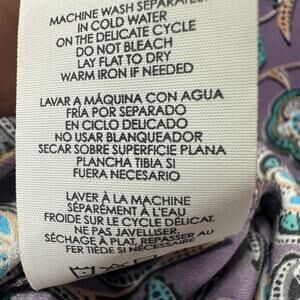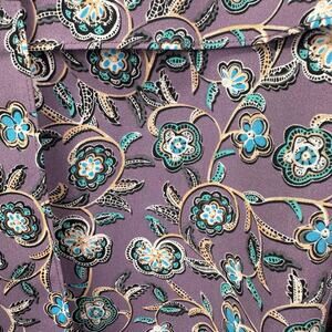 The CAbi #3453 Floral Print Scrollwork Cami Top in size small is a dainty and whimsical addition to any woman's wardrobe. This purple tank top features a V-neckline, sleeveless design, and adjustable spaghetti straps for a comfortable fit. The floral print and girly accents make it perfect for a variety of occasions, from a casual day out to a workwear setting. Made from polyester, this top is easy to care for with machine washable instructions. Add a touch of femininity and color to your outfit with this charming and feminine top from CAbi.