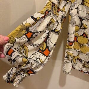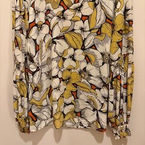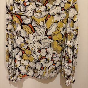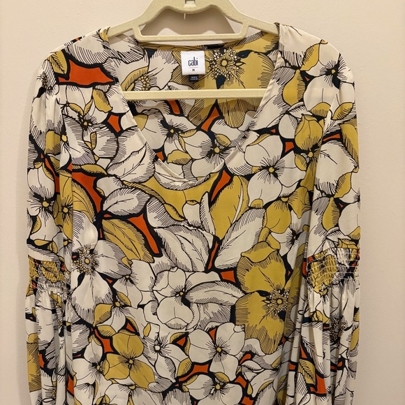 CAbi #3954 Sequel Yellow/Black Blouse - Size Medium. Gently worn. Elastic in the sleeves, just above elbow area and at wrists. You can push the sleeves up for more of a 3/4 length sleeve. Sleeves are loose and blousey.