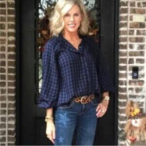 Blue & Black Buffalo Plaid Ruffle Trim Button Front Rayon Blouse CAbi Aberdeen Shirt #3961