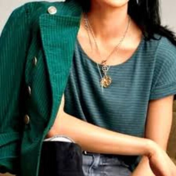Let’s groove tonight in the Groove Tee, a teal-striped T-shirt designed in CAbi’s super soft baby rib fabrication. With a stretch this comfy, you’re free to bust a move!
