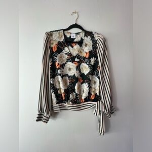 CAbi 4043 Enchant Blouse Xs Black Floral Striped smocked sleeve Vneck 1120