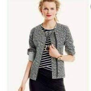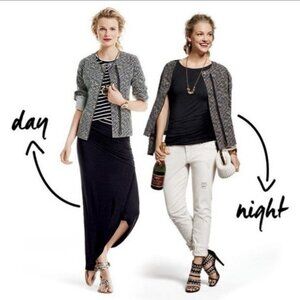 Asymmetrical jacket will add polish to even the most casual items in your closet. Full Front zip-up with snap at top front snaps on sleeve ends. Excellent pre-owned condition.