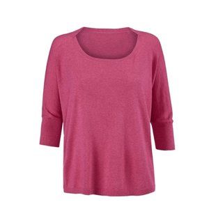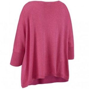 Oversized, slightly cropped, boxy fit sweater. Style Name: Cartwheel #5279. Fushia Pink lightweight knit, bateau neckline, and 3/4 length Dolman sleeves.