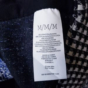 “Jackie-O” style blazer with mixed pattern tweed like fabric. The houndstooth trim gives the blazer a Mod throw back. 3 buttons down front with optional tie around neckline. 3/4 length sleeves. Side pockets. Blue, black and white.